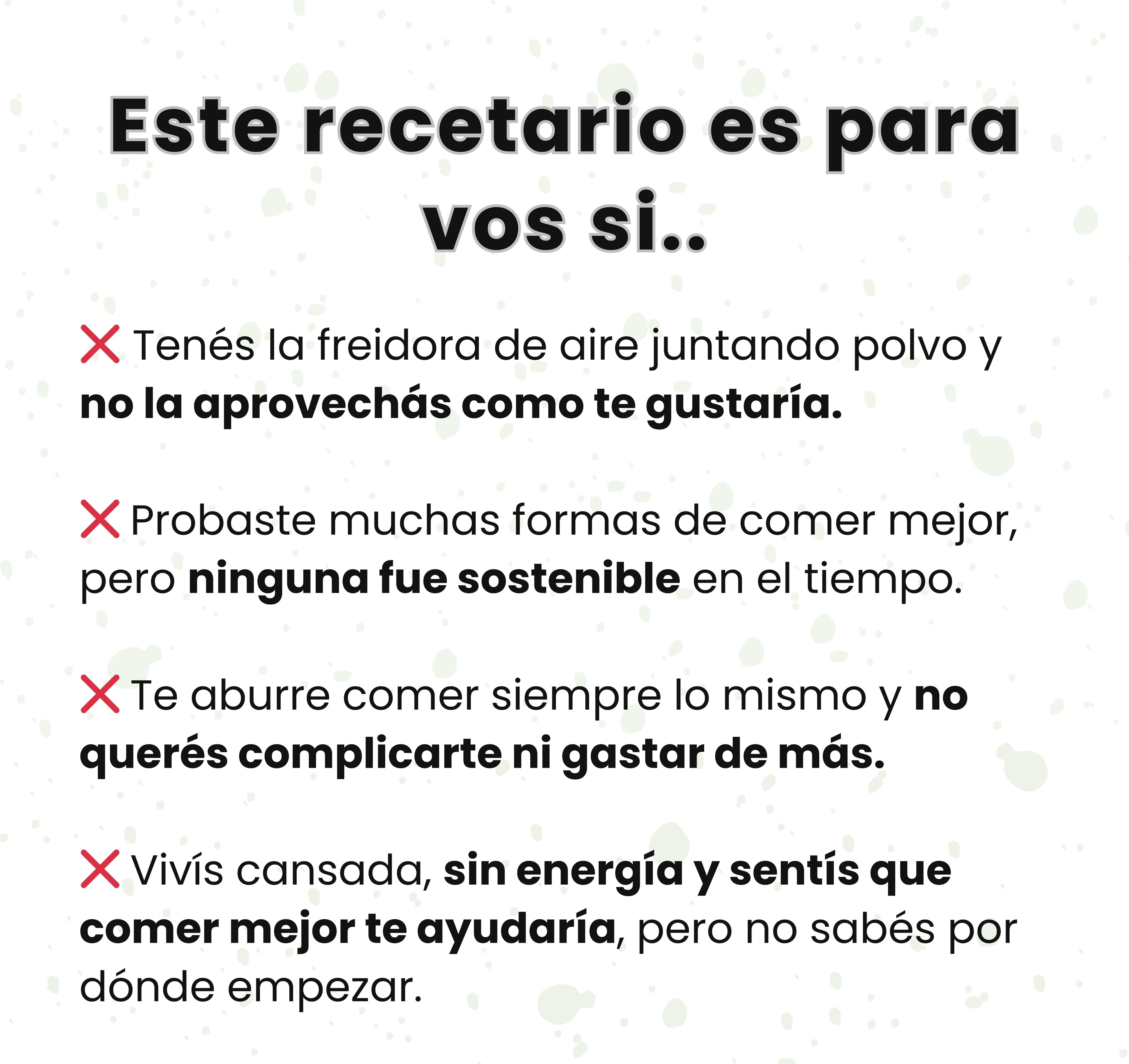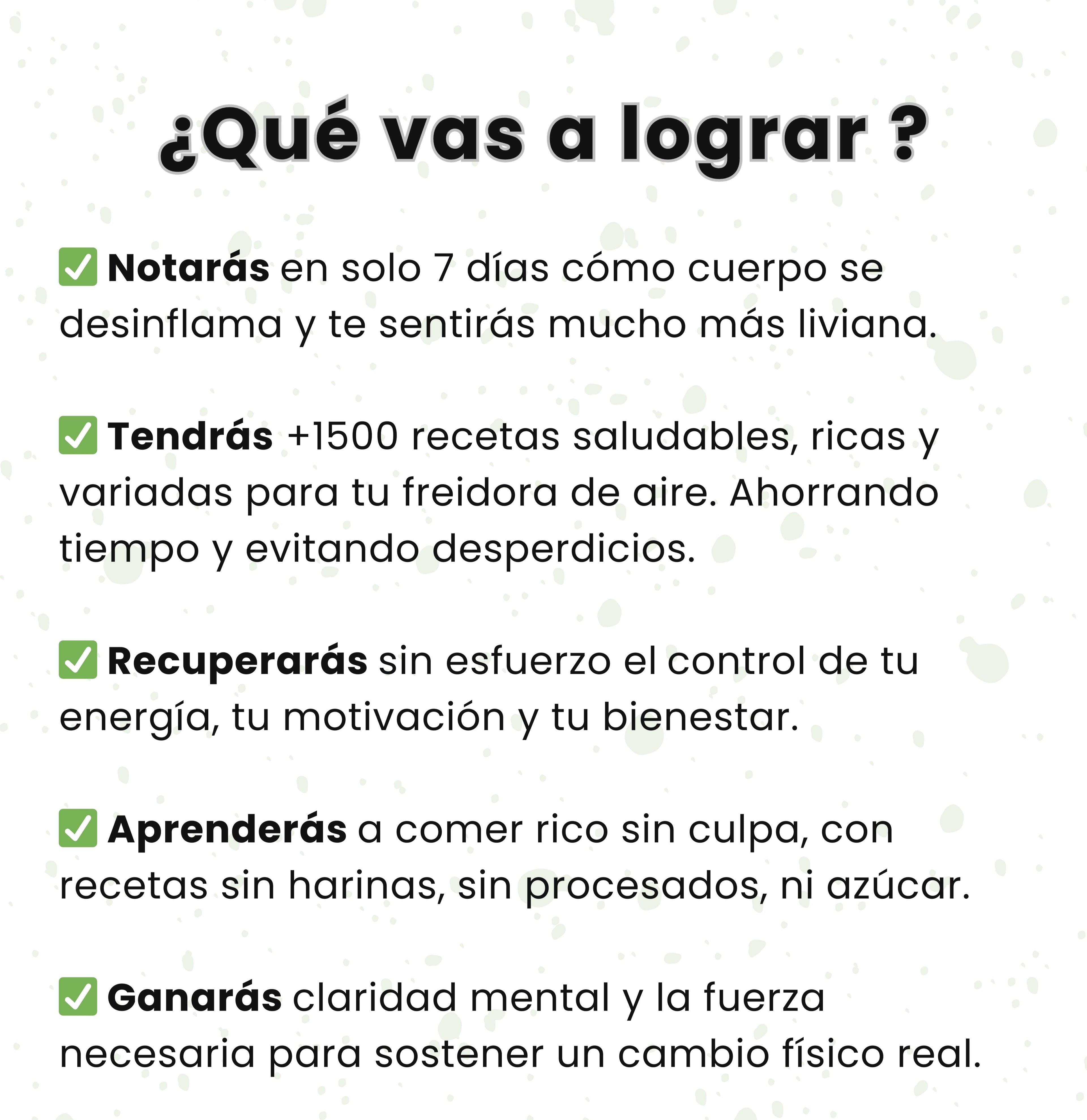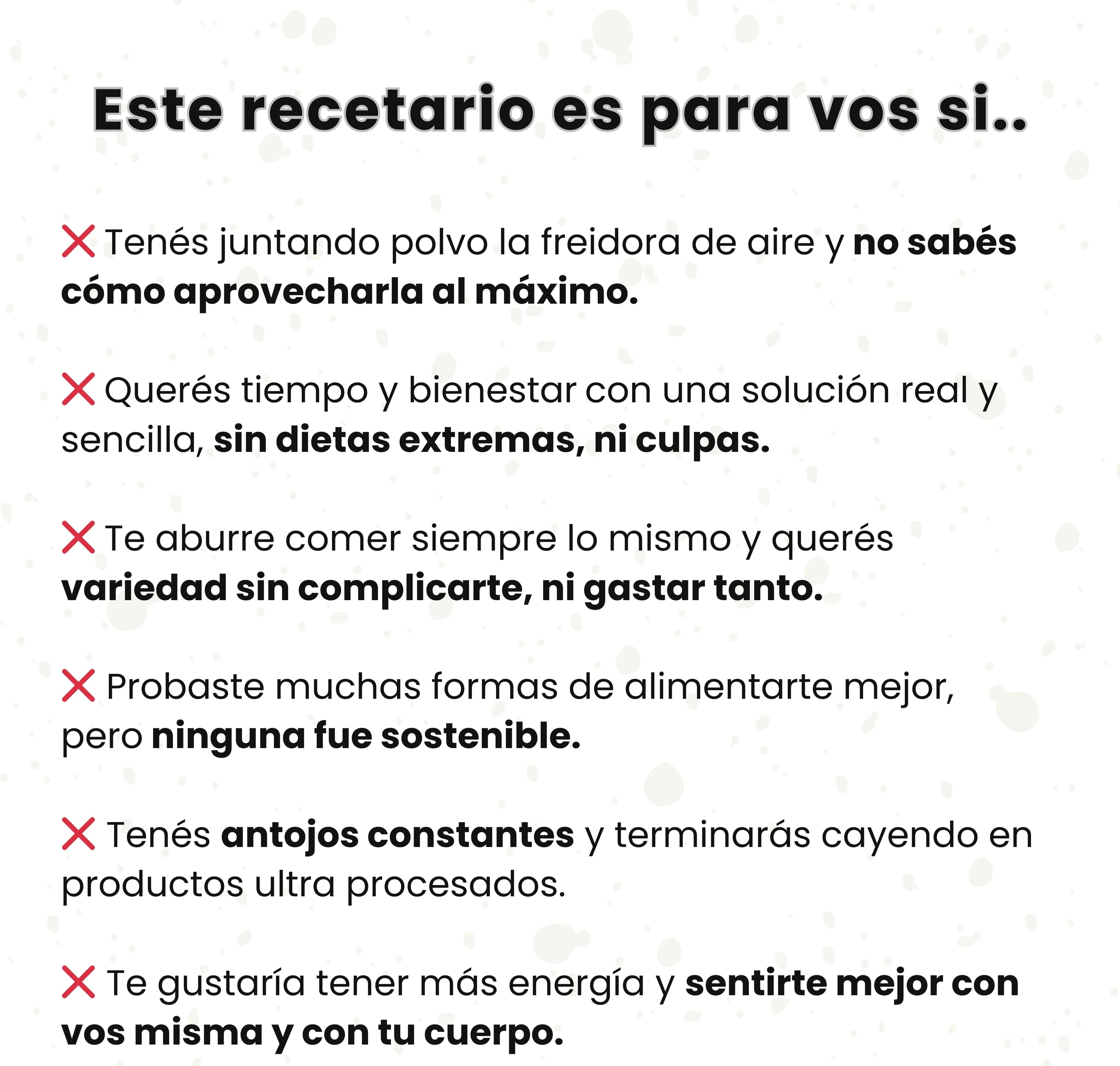 Probá el recetario sin miedo: si en 7 días no sentís que te simplifica la vida, comés más rico y cuidás tu salud con la freidora, escribinos y te devolvemos el 100%.