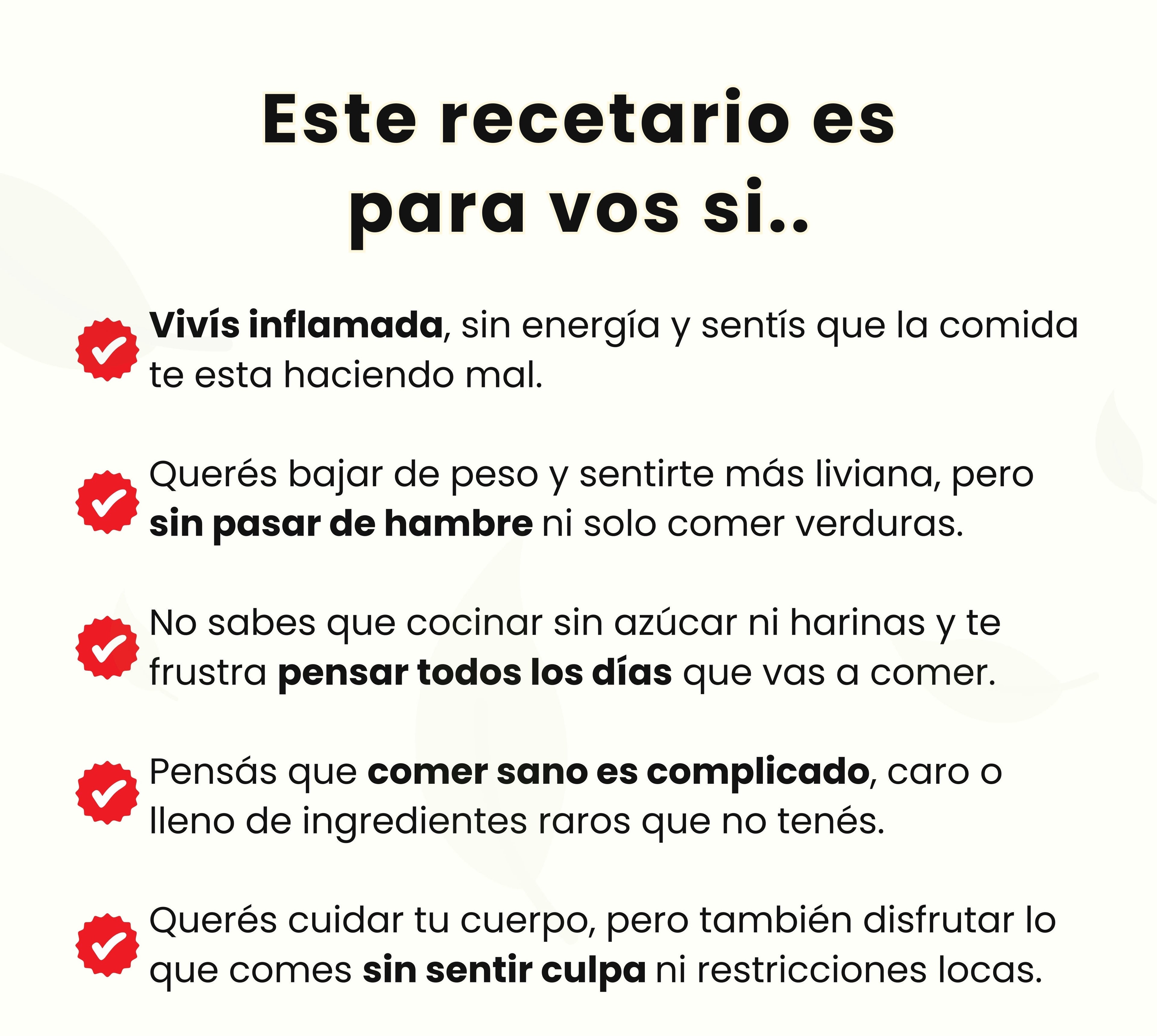 Probá el recetario sin miedo: si en 7 días no sentís que te simplifica la vida, comés más rico y mejorás tu salud, escribinos y te devolvemos el 100%.