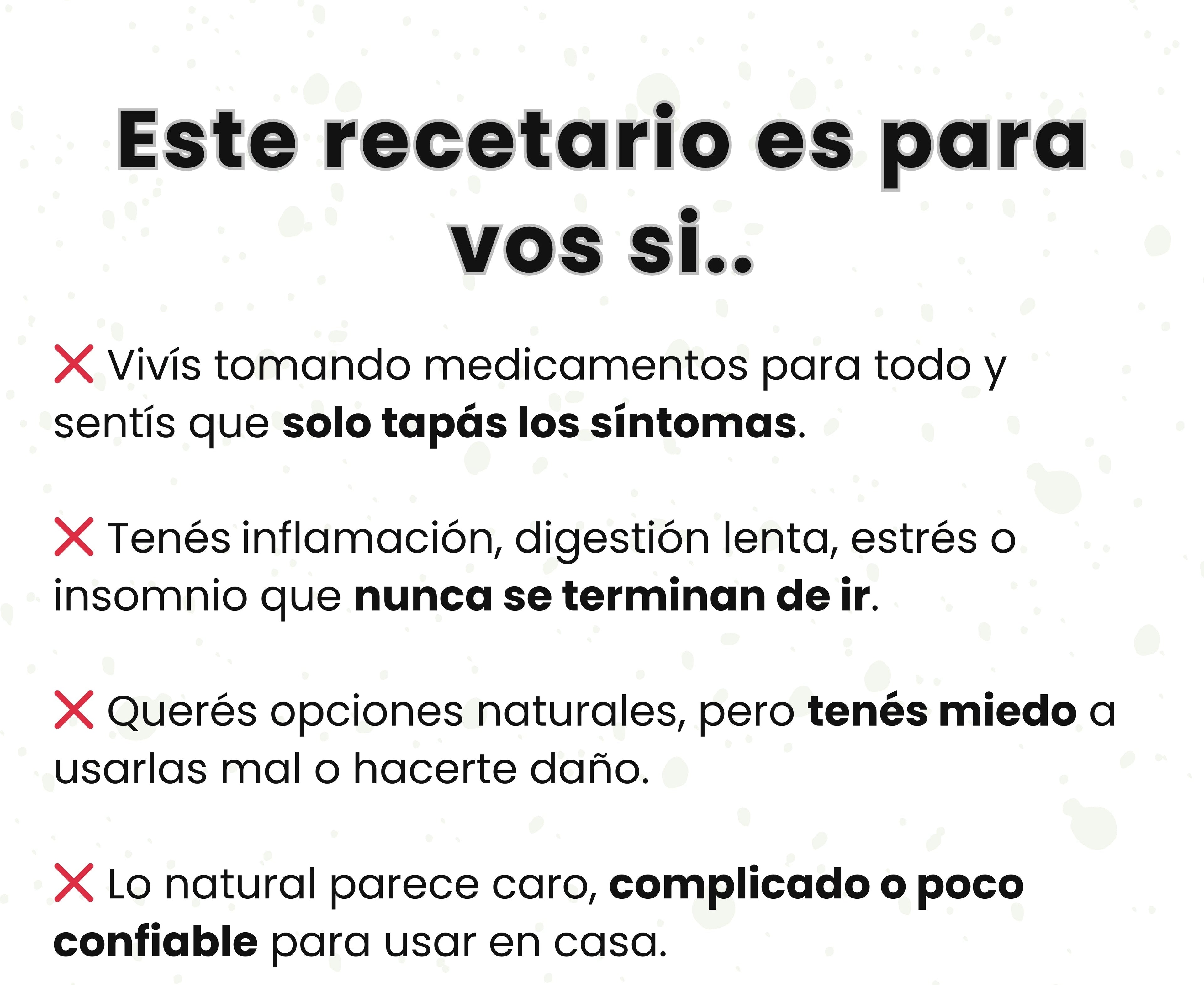 Probá el recetario sin miedo: si en 7 días no sentís que te da claridad, confianza y soluciones naturales para cuidar tu salud en casa, escribinos y te devolvemos el 100%.