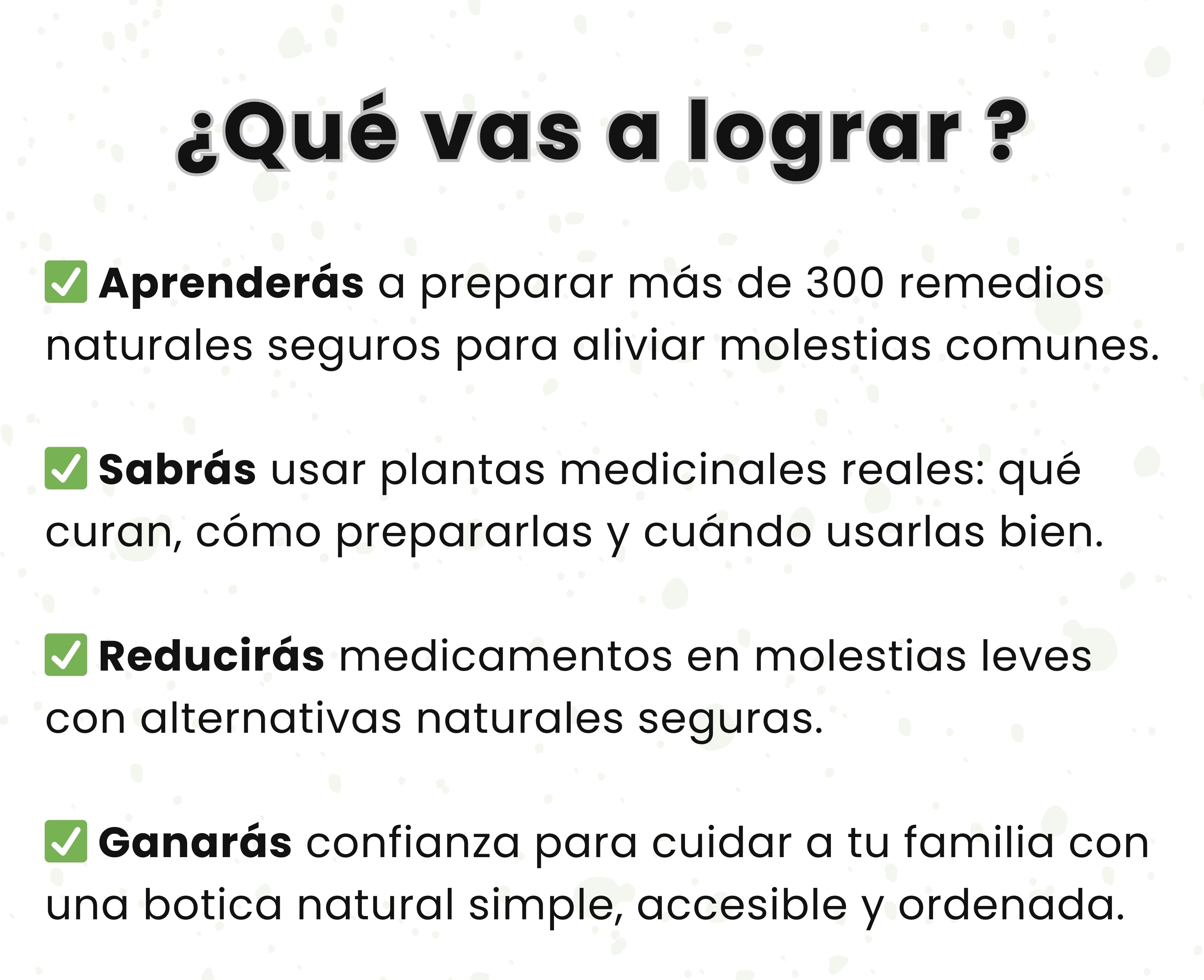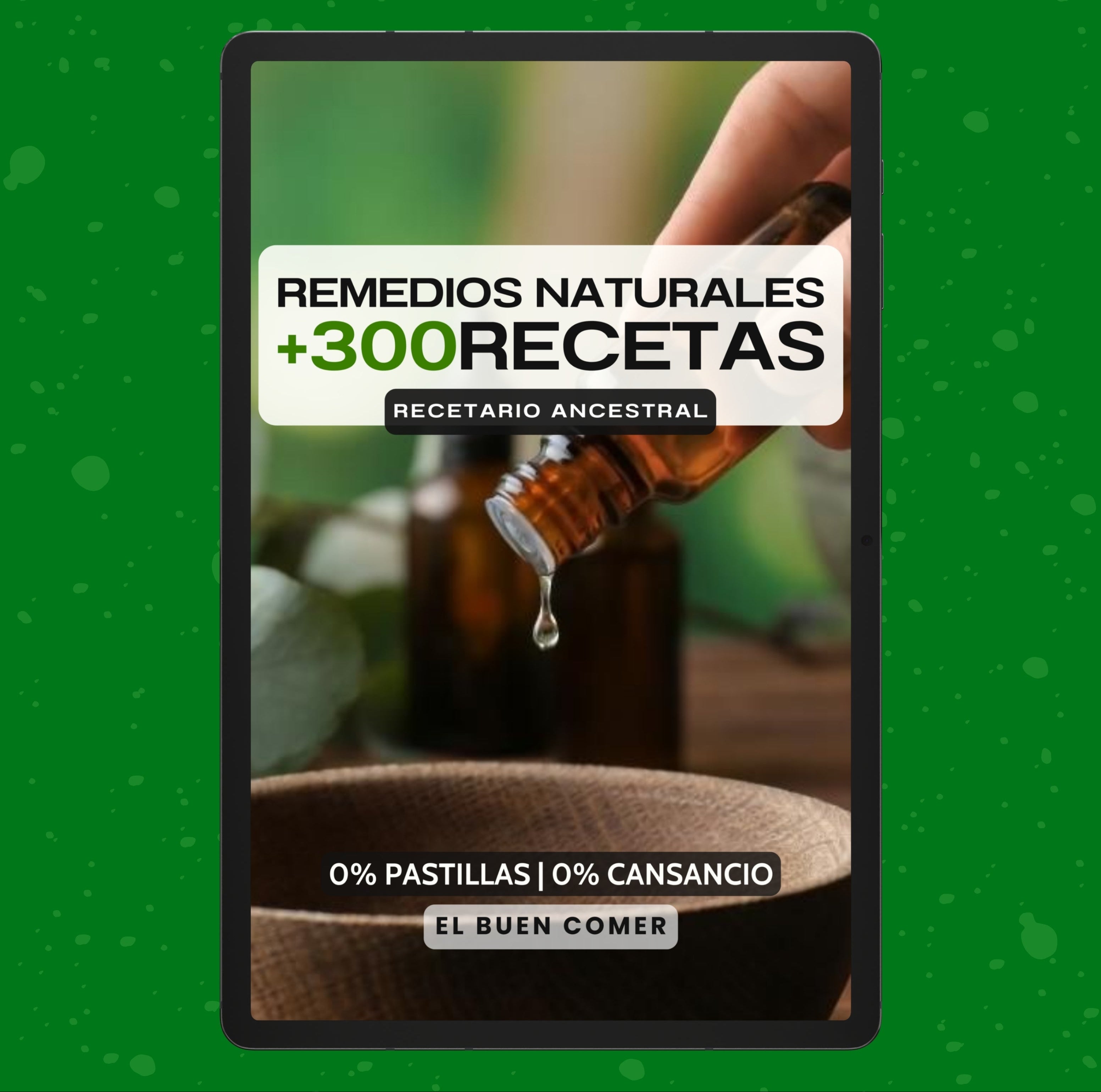 Recibís un recetario digital en formato PDF con más de 300 remedios naturales, organizado por síntomas y usos. Llega directo a tu correo y es de acceso para siempre.